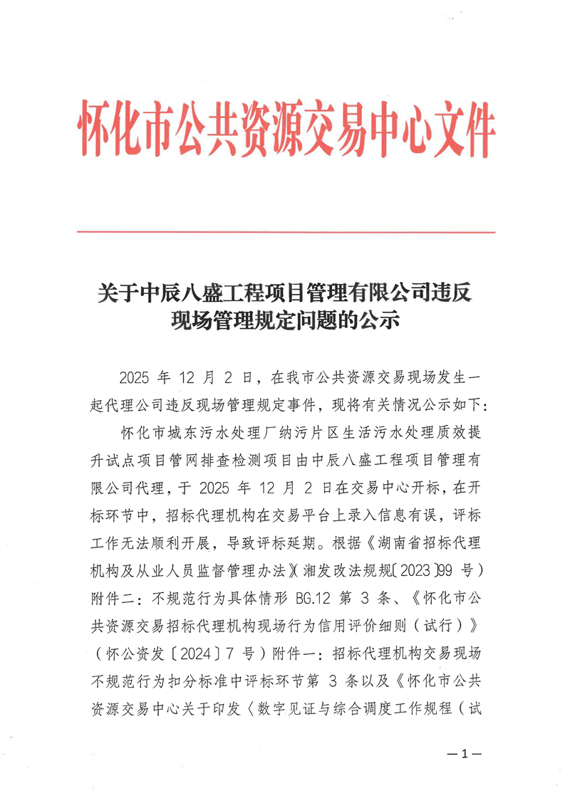 关于中辰八盛工程项目管理有限公司违反现场管理规定问题的公示
